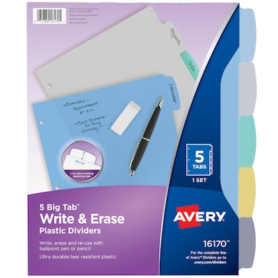 › Durable-Plastic-Dividers-BindersAvery Durable Plastic 8-Tab Write & Erase Big Tab Dividers ... Apr 13, 2021 · The "package dimensions" in the product description says these are 9.25 inches wide. They are actually only 8.5 inches wide which is just wide enough to separate papers only. Unforunately, I'm separating page protectors - which stick out farther. The tabs are completely covered, making the dividers useless.